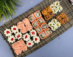 Всего за 99 руб. Лосось, омлет Тамаго, сливочный сыр, васаби, соус Тобико, соус Унаги, кунжут.